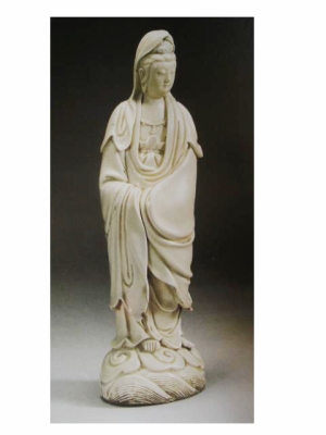 在德化窯歷代作品中,明代的“象牙白”最美,“象牙白”作品中,瓷塑最精。吳仁敬、辛安潮著《中國陶瓷史》敘述:“白建似定窯,無開片,質(zhì)若乳白之滑膩,宛若象牙,光色如絹,釉水瑩厚,以善制佛像著名,如如來、彌陀、觀世音、菩提、達摩等,皆精品也。明季自寧波流入日本,日本商人甚至不惜以萬金購之,足見其精美矣。”德化窯瓷塑以人物著稱,題材有觀音、如來、達摩、八仙、壽星、羅漢、文昌帝、多臂準提等等,形象傳神,衣紋簡練、線條流暢,制作技法有模制和捏塑兩種。