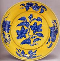 黃釉青花器以明中期的黃釉青花花果紋盤最為有代表性,明晚期并不多見,在清三代多有仿制,其中康熙、乾隆兩朝仿制的最像。青花花果紋盤有兩種基本裝飾紋樣,盤內(nèi)壁畫荔枝、枇杷的,盤心畫石榴花一枝, 外壁畫番蓮花;盤內(nèi)壁畫石榴、葡萄的,盤心畫玉蘭花一枝,外壁畫牡丹花。這種把黃藍(lán)兩種色調(diào)共存于一種器物上的藝術(shù)品更受當(dāng)今收藏家的喜愛。在目前的拍賣中,有數(shù)據(jù)可查的黃釉青花器只有兩件拍器,但都以高價(jià)成交,且都在四年以前成交,而近四年來并不見有黃釉青花器現(xiàn)身拍場。據(jù)估計(jì),1996年翰海秋拍中以286萬元成交的明弘治黃釉青花花盤目前的市場價(jià)值至少在千萬元以上。