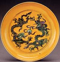 黃釉在明清兩代皇室中的使用是有規(guī)定的,不是任何人都可以使用的。據(jù)史料考證,在明代皇宮中,器里外都施黃釉的瓷器為皇太后、皇后的用具;皇貴妃則用器物內(nèi)壁為黃釉,外壁為普通透明釉的器物,貴妃用黃釉綠龍器或黃地綠 龍器;嬪妃用藍(lán)地黃龍器;貴人則不可以用黃釉器。因此我們在投資黃釉瓷的過程中,對認(rèn)知黃釉瓷的種類很重要。不同的黃釉瓷代表不同的等級,但我們同時(shí)還要從稀有性上進(jìn)行投資,比如一些黃釉彩瓷,在黃釉彩瓷中,綠彩瓷價(jià)格略低外,而其它黃釉彩瓷級別雖低,但因存世量有限,在藝術(shù)品市場中并不多見,且工藝繁瑣反而價(jià)高一些。