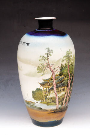 蔡玲玲,筆名玉人,江西省工藝美術(shù)大師,江西省高級(jí)工藝美術(shù)師,她的“山水”陶瓷作品展現(xiàn)了女藝術(shù)家特有的敏感和細(xì)膩。在表現(xiàn)主題上,蔡玲玲突破了傳統(tǒng)陶瓷一貫的方式而追求現(xiàn)實(shí)表達(dá),并能充分運(yùn)用景德鎮(zhèn)多種傳統(tǒng)裝飾技法來(lái)呈現(xiàn)自己對(duì)大自然的崇敬和女性特有的平和情懷。她大膽地利用陶瓷色釉在窯變中產(chǎn)生的特殊效果,使天空如彩虹、朝霞變化萬(wàn)千,有的更似萬(wàn)株禮花綻放蒼穹。藍(lán)或褐的色釉窯變則讓大地呈現(xiàn)厚土的凝重肌理。古彩、粉彩、新彩的多種技法不但豐富了作品的色彩,更突現(xiàn)了畫(huà)面的層次感。在她作品中,遠(yuǎn)山連綿起伏,近水碧波蕩漾;幾間古樸的農(nóng)舍,數(shù)株蒼勁的大樹(shù),河邊小船靜泊,山澗瀑布飛流;白云飄渺,炊煙繚繞;天空小鳥(niǎo)自由飛翔,水中群鴨逐波戲水;村姑或挎籃拾階而上,或倚橋婉聲歌唱。整個(gè)畫(huà)面充滿著春意盎然的田園風(fēng)光,又使人宛如置身于寧?kù)o祥和的世外仙境。源于生活而高于生活,用景德鎮(zhèn)特有的陶瓷文化資源讓我們?cè)诔鞘行[的環(huán)境中品嘗美妙的田園風(fēng)光,陶醉在山水天地之間,這正是蔡玲玲山水作品的神韻之處。