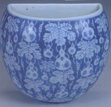 壁瓶因掛于壁面而得名。這件壁瓶高10.5cm,上面繪白色串枝葫蘆紋,葫蘆蔓葉相互纏繞,寓意‘‘子孫萬代”。其制作手法是在胎上先刻好花紋輪廓線,在線外施青料,露出白色花紋,再罩一層透明釉,經(jīng)高溫?zé)贫伞?/p>