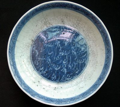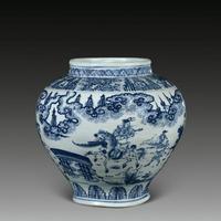 總的說(shuō)來(lái),此期器型主要還是瓶、罐、碗、杯、盤等幾類。所用青料仍有部分是“蘇青”。青花發(fā)色有的濃艷,與宣德器相近似,有的淡雅,與成化器較接近。釉面多泛灰。胎體較厚重。底足修削不細(xì)膩,有敦厚感;多見淺寬平砂底,有的有粘砂現(xiàn)象,有的見火石紅。正統(tǒng)時(shí)的瓶、罐器口為直頸形,與宣德器一致;天順時(shí)的則是象梯形的上窄下闊形,與成化時(shí)相近。瓶、罐的身體均是豐肩、圓腹、下收、足稍外撇;梅瓶的器身較宣德的修長(zhǎng)。紋飾以一筆點(diǎn)劃為主,有人物、花卉、龍鳳、孔雀等。人物的背景多畫大片云氣紋。瓶、罐邊飾喜畫海水紋或蕉葉紋,其蕉葉中梗留白,葉面較寬大,像小樹一般?钭R(shí)正統(tǒng)的是福字款;景泰開始款識(shí)從器心移到器底,除福字外,還有“太平年造”、“太平”、“大明年造”等;天順有紀(jì)年款、梵文款等。