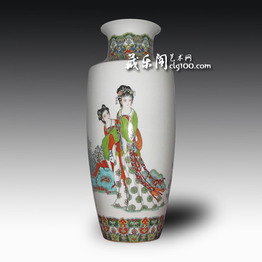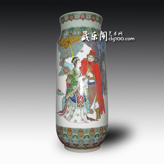 名家鑒賞:《西廂記》是我國家喻戶曉的古典戲劇名著,它敘述了書生張君瑞和相國小姐崔鶯鶯邂逅相遇、一見鐘情,經(jīng)紅娘的幫助下結(jié)合的愛情故事。方復(fù)老師熟悉歷史典故和民間傳說,把民間故事融入于瓷瓶中。他筆下的仕女,體態(tài)婀娜多姿,衣物紋飾色彩紅綠分明,層次較少,彩色鮮明透徹。