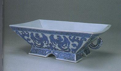 方形器物最難制作,因造坯時,要棱角正直,結(jié)合緊密,上下左  右要對稱。此簋仿青銅器,做工精細,造型優(yōu)美,給人以古樸莊重之  美感。高7.7cm,口徑23.7*14.3cm。主題紋飾為騰躍飛舞的夔鳳紋,青花顏色明快。底款為朱紅“鋤  月山莊仿吉”,鋤月山莊是清代光緒時期景德鎮(zhèn)瓷器堂名款。