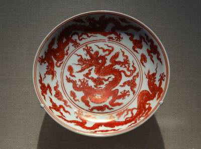 官窯瓷器的紋飾比較工整、細(xì)致,民窯器物的紋飾筆法瀟灑、自由奔放,生動地表現(xiàn)了對現(xiàn)實美好生活的愿望。畫面題材很豐富,人物、花鳥、飛禽走獸無所不有,有些畫面取材于錦緞上的紋飾,或受小說木刻插圖影響,或取材于戲劇、民間故事傳說等。有些內(nèi)容尤其是在官窯器物上,反映了當(dāng)時封建統(tǒng)治者的思想意識,有些則帶有封建迷信色彩。明代所畫的人物比較挺拔,小孩兒頭比較肥大,不合比例,前額及后腦凸出,明代早期龍鱗畫得比較精細(xì),晚期有的龍鱗畫得草率,龍爪畫得比清代簡單,但龍爪雄壯有力。畫龍比較窄瘦、龍咀較長,一般都稱為豬咀龍。此時八寶紋的排列多為輪、螺、傘、蓋、花、魚、罐、腸。后仿品有時忽略此點,在鑒定時應(yīng)注意觀察。明代瓷器上有以文字作為紋飾裝飾內(nèi)容,如梵文、阿拉伯文、壽字、福字等。紋飾多為云龍、云鳳、纏枝花卉,后來出現(xiàn)人物、飛禽走獸、八仙、人物故事等。官窯瓷器比較工整細(xì)致,民窯比較粗放、生動。