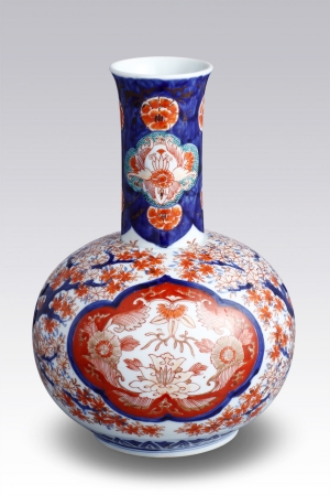 1624年后,中國青花瓷輸入日本,伊萬里青花中出現(xiàn)了完全仿制明代青花瓷的作品,如戶栗美術(shù)館收藏的青花雙耳扁壺造型、裝飾完全仿制永樂青花扁壺。同時,受明代天啟青花和所謂“祥瑞”器的影響,伊萬里青花瓷紋樣出現(xiàn)了簡潔、疏朗或通體裝飾兩種傾向。青花山水紋缽就具有明顯的天啟青花山水風(fēng)格,體外壁以輕佻的筆觸,寫意的筆法,不事雕琢地描繪出遠(yuǎn)山、近水,還有那些影影綽綽的小橋、樹木、花草、人物、飛鳥,畫面空靈悠遠(yuǎn),給人以無限遐想。而松岡美術(shù)館收藏的青花鳳凰紋八角蓋罐可說是通體裝飾的典范,上至蓋鈕,下至底足,花紋布滿了整個罐體,腹部飾展翅的鳳凰立在巖石上,四周花團(tuán)錦簇,蓋面也繪同樣的圖案,頸、肩及近底部都飾有連續(xù)花紋,畫面繁縟華麗,布局密不透風(fēng)。整器高大端莊,氣勢宏偉,做工精致,釉色白凈,青花發(fā)色濃艷,是一件仿中國漳州、汕頭等南方出口青花瓷(日本稱作吳州染付)的佳作。京燒代表人物永樂保全創(chuàng)作的青花祥瑞手花瓶也明顯受到景德鎮(zhèn)民窯出口青花瓷“祥瑞瓷”的影響。