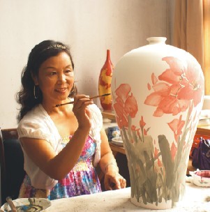 “很喜歡醴陵的釉下五彩瓷器,”吳培芝邊在瓶坯上創(chuàng)作《秋風迎得美人笑》邊說道,“在瓷器上作畫與紙上作畫在用色與構圖上有很大的區(qū)別,這更加吸引了我的濃厚興趣。”她表示,醴陵釉下五彩歷史悠久,近年來已在國內(nèi)國外享有越來越高的聲譽,很高興能與之結緣。