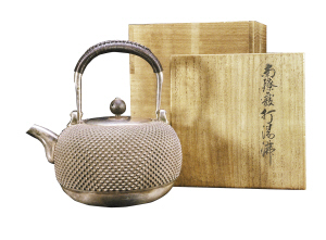 日本室町時(shí)代的生駒茶道用品都是古都奈良的傳統(tǒng)名品。歷來(lái)為皇室貴族所用。壺身滿(mǎn)鋪漸變而勻稱(chēng)的霧霰紋飾,飽滿(mǎn)而頗具質(zhì)感,流線設(shè)計(jì)優(yōu)雅美觀;壺蓋與壺身契合度較好,鐵摘獨(dú)特精致又中和了溫婉之氣;流嘴為鼓肚小口設(shè)計(jì),出水順暢。用銀壺煮水比鐵壺要軟很多倍,用軟水泡茶,不易改變湯色,煮水時(shí)間快,最重清揚(yáng)的特性,銀壺煮水時(shí)所釋放出的銀離子鈉離子能為人身體起到排毒的作用。該器銀色純正,體型巨大,內(nèi)部以及藤把手保存完好,為一般銀壺所難匹敵,原配木盒。東南商報(bào)記者鮑云潔黃銀鳳整理