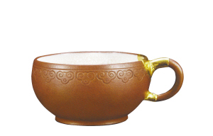 顧景舟原名景洲,別稱(chēng)曼希、瘦萍、武陵逸人、荊南山樵。自號(hào)壺叟、老萍。他是宜興紫砂名藝人,中國(guó)美術(shù)家協(xié)會(huì)會(huì)員,中國(guó)工藝美術(shù)大師。帶徒徐漢棠、高海庚、李昌鴻、沈遽華、束鳳英、吳群祥等人。一生三次參加全國(guó)工藝美術(shù)代表大會(huì),被海內(nèi)外譽(yù)為“壺藝泰斗”,作品為海內(nèi)外各大博物館、文物館收藏。該器柄處受損,主人真愛(ài)不已,著黃金以云紋巧做補(bǔ)之,更具風(fēng)韻。紫玉金砂完美結(jié)合。
