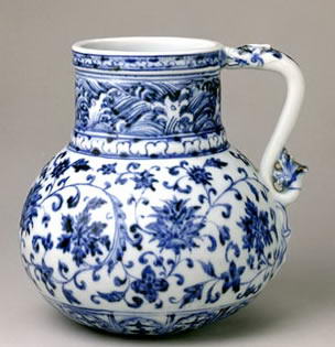 據(jù)我國明、清瓷器鑒別權(quán)威耿寶昌先生指出,永樂時(shí)期燒制的青花瓷“花澆”頸長、腹圓,把柄作龍形;宣德時(shí)期者頸短、腹扁,把柄為寬帶式。