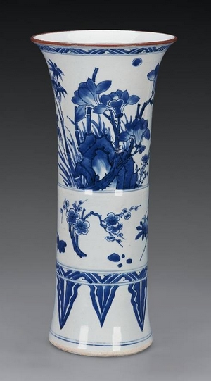 順治青花器主要有以下幾方面的特點:器型較少,主要有爐、觚、瓶、大小盤、碗、罐等。胎體總的來說較粗糙,大器如爐、大盤、觚等胎體厚重,小器如小盤、碗等胎體則較輕薄。但也有個別器物胎質(zhì)細(xì)膩、致密的,可見糯米狀。底釉多白中閃青,有的還略顯泛灰,釉層稀薄。青花料應(yīng)是浙料和石子青兩種并用,致使發(fā)色有的青翠、有的青藍(lán)。其中爐的青花發(fā)色多顯青翠,其它器物的發(fā)色多顯灰藍(lán)。紋飾多見花鳥、山水、洞石、秋草、江上小舟、怪獸、瑞獸、芭蕉、云氣等。大盤喜歡在口沿處畫一青花線圈,再在圈內(nèi)畫主體紋飾;小盤多在盤面一側(cè)畫一片梧桐葉,另一側(cè)書“梧桐一葉落,天下盡皆秋”等相近的詩句。瓶、觚、罐等大器也喜歡用青花線作紋飾的分隔。畫法以勾勒、平涂、渲染、線描相結(jié)合。繪畫筆調(diào)隨意,雖然比晚明時工整,但仍未見康熙時的嚴(yán)謹(jǐn)、細(xì)致的作風(fēng)。畫面布局較豐滿,尤其是大盤、罐、瓶、觚等類器物。開始出現(xiàn)皴法和濃淡色階的變化,但尚不成熟。瓶、觚等多平砂底。盤、碗、罐等底部多見縮釉點,底足粘砂較常見。碗的底部多跳刀痕。民窯器多、官窯器少,而且有年款的器物甚少。