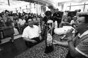 "這個吊玉瓶價值在一千萬元以上,是由我國明代的玉雕大師陸子岡所做,其材質(zhì)為一級羊脂白玉,非常難得,入圍民間十大國寶的候選名單絕對沒問題……"8月20日,在中海·紫御華府銷售中心現(xiàn)場舉行的吉林省首屆"回流國寶展"暨民間十大國寶評選、鑒寶現(xiàn)場,4位專家觀點一致,89號江先生帶來的寶貝引得全場驚嘆與關(guān)注。