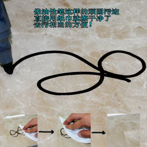 這是最讓小陶意外的一個測試。大家都曾經(jīng)用過油性筆,都知道它干后是很難擦掉的。小陶用油性筆在卡布奇諾上涂鴉完就出門玩去了,回來拿起紙巾想狠命擦,不料都沒用上多大的勁兒,就把筆跡擦得干干凈凈了,沒有一絲痕跡。小陶有點傻眼,這項測試不得不給出滿分。