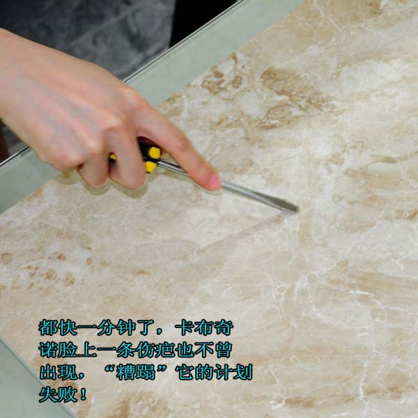 毫無疑問,這是小陶最喜歡的一項測試。拿著螺絲刀肆意“糟蹋”完美的藝術(shù)品,每次都讓小陶很期待?蛇@次小陶遇到了敵手。小陶狠命地來回劃半天了,預(yù)想中的大花臉仍然沒有出現(xiàn),卡布奇諾臉上一條傷疤也不曾出現(xiàn)。小陶只得放棄,憧憬下一項測試能把它推下神壇吧。