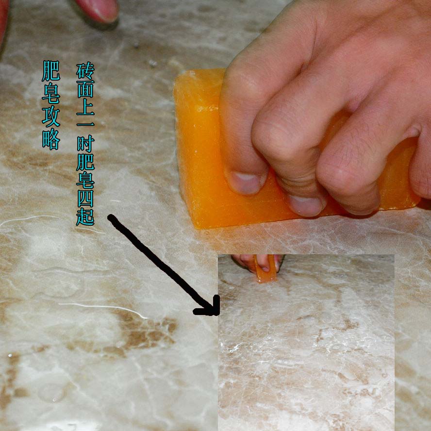 小陶先用早已準(zhǔn)備好的最滑的肥皂水給瓷磚涂了個遍,瓷磚表面頓時泡泡四起。