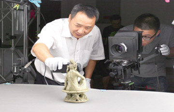 8月19日,溫州博物館工作人員用從丹麥引進(jìn)的3.96億像素圖像采集系統(tǒng)(一般相機(jī)像素為1000萬左右),拍攝北宋甌窯青釉觀音坐像。這一圖像采集系統(tǒng)將為大型圖書《中國·甌窯》提供高質(zhì)量的照片。