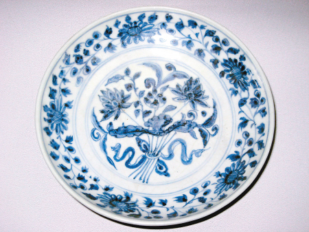 [提要] 藏品來歷:藏家劉萬忠是西安城南人,早年大學畢業(yè)后分配到一政府機關工作,事業(yè)上可謂一帆風順。”說起眼前這件元代青花一束蓮紋盤的收藏來歷,老先生眼睛濕潤了。二人一陣擁抱寒暄后,老胡從包里取出一個青花瓷盤,說是送給老劉的生日禮物。
