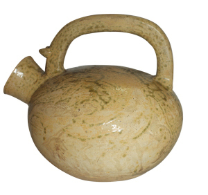 原始青瓷或稱“原始瓷器”,也稱“釉陶”、“青釉器”等。瓷器原始階段時(shí)的制品,一般認(rèn)為產(chǎn)生于商周時(shí)期。原始青瓷制品的胎體含鐵量在2%左右,經(jīng)過(guò)人工施釉,在1200℃左右的高溫中燒成。器物大多為尊、卣、簋、壺、豆、罐、鼎、杯、盂等盛器,春秋、戰(zhàn)國(guó)時(shí)也有一部分鐘、錞等仿青銅禮器。原始青瓷在浙江、江蘇、安徽等地都有發(fā)現(xiàn)。經(jīng)化驗(yàn)后證明,這些原始青瓷的瓷胎系用高嶺土燒制而成,瓷釉光潤(rùn),多施在器表及口沿內(nèi),器內(nèi)施釉的少見(jiàn)。其釉為以鐵的氧化物為著色劑的高溫釉,釉色以青綠為主,少數(shù)呈黃綠色或黃褐色。器物制作基本上采用輪制法,也有手捏和泥條盤筑法成形的。從瓷器的胎質(zhì)、釉料、燒成溫度及物理性能看,已具備瓷器的基本特征,但由于當(dāng)時(shí)的工藝技術(shù)水平比較低,原料粗糙,雜質(zhì)多,而且胎料的可塑性較差,胎體頗多裂紋、變形,像圖中這只提梁壺這樣造型規(guī)整的器物并不多見(jiàn)。這只戰(zhàn)國(guó)原始青瓷提梁壺是當(dāng)時(shí)流行于貴族階層的一種酒具,雖說(shuō)裝飾略少,但外形上運(yùn)用了簡(jiǎn)潔流暢的曲線,圓滿古拙的器身上是一條纖細(xì)方形青龍為提梁,向人們展示有器型(壺身)、有線條(提梁)、有神光的威嚴(yán),有藝術(shù)的夸張,視覺(jué)上整體穩(wěn)重又不活潑,給人以精神與藝術(shù)的雙重享受,實(shí)為一件值得珍藏與欣賞的古代藝術(shù)品。