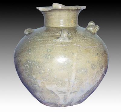 今年“五一”節(jié),筆者早早就趕到了南京朝天宮古玩市場,發(fā)現(xiàn)有一個攤主賣的基本都是高古瓷器,有晉瓷、宋瓷,有整有破。只見一個買主正在和賣家為一只東晉四系罐討價還價。我眼睛一閃,攤上一只好像西晉盤口雞首壺的殘件立刻躍入眼簾,造型古樸。見買家和賣家依然激烈地討價還價,旁邊人都在看著這兩個人,我這時蹲下來,從人縫中把那只破雞壺從里面給鉤了出來。上手細(xì)看,一只典型的西晉盤口雞首壺(見圖),用手一量約高28cm,此壺殘缺盤口,圓腹如球形,腹身帶有一條連結(jié)雞首、雞尾及雙系的裝飾帶,寬約2厘米,遍布壓印的斜方格紋和兩圈太陽花。胎骨灰白,釉色偏黃,吃土較重,施釉到底,罐底有明顯的支燒火石紅痕跡。罐身正面塑貼一個母雞頭,正作張口鳴叫之態(tài),在與雞頭相對的另一端塑出雞尾,罐自然成為雞身狀。此刻我心中大樂,詢問價錢,賣家也顧不得與我討價還價,我最終以不高的價錢將之拿下,收入囊中,繼續(xù)逛其他地攤?cè)チ恕?/p>