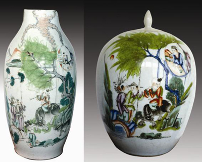 此四件瓷器,均產(chǎn)于我國戰(zhàn)亂頻頻的清末與民國,瓷藝家們拋卻戰(zhàn)亂的喧囂,用優(yōu)美的筆觸,為人們營造了一種世外桃園般的“漁樵耕讀”的理想意境。實(shí)為清末民國瓷器中瓷、畫俱佳的上品。
