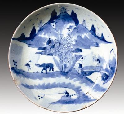 圖1:光緒青花“漁樵耕讀”瓷盤,該瓷盤產(chǎn)于景德鎮(zhèn),直徑24厘米,胎瓷潔白、青花發(fā)色純正淡雅,一幅中國傳統(tǒng)的寫意山水“漁樵耕讀”圖躍然眼前。漁夫在河邊靜坐垂釣,樵夫擔(dān)著兩捆柴禾吃力地在石拱橋上蹣跚行走,犁田歸來的耕夫牽著翹首擺尾的水牛緩緩而行,樹下屋中的書生,低頭弓腰苦讀之乎者也……