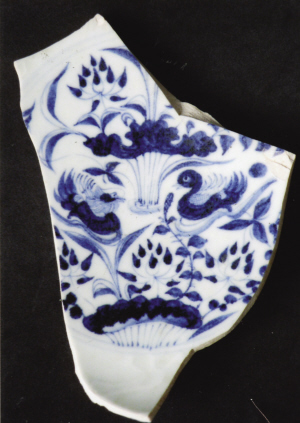 這只元代“至正型”青花瓷片長15.6厘米,寬10.3厘米,高4.4厘米,足徑7.7厘米。