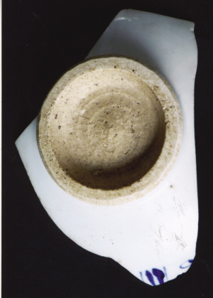 胎質(zhì):堅(jiān)硬、厚足墻、足底及內(nèi)為沙底略顯淡黃色,并帶有少量黑褐色沙粒,旋痕乳丁有明顯凸?fàn),殘片裂面有?xì)小縫隙孔。