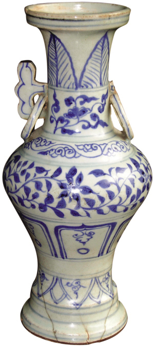 近二十年來,元青花贗品鋪天蓋地,而此件,“開門”的理由有三:一、紋飾樸實自在,無任何矯揉造作、喧嘩之態(tài);二、器口內(nèi)的土沁、斑駁極為生動、流暢,完整地記錄了出土之前數(shù)百年的生存環(huán)境;三、近百年來(傳清末民國初時出土、民國時由杭州朱宏達(dá)收藏)的人間滄桑,于釉面上赫然在目。尤其是從瓶腹的易磨損處,可以認(rèn)定釉面上的使用留痕合乎客觀,是真實的,甚至可以說是不可偽造的。當(dāng)然,此物的工藝手法和造型均顯得十分古拙,其形制亦典雅,惟在元景德鎮(zhèn)窯青白瓷和龍泉窯青瓷中有相類的戟耳瓶,這些,均屬于鑒真上的間接理由。