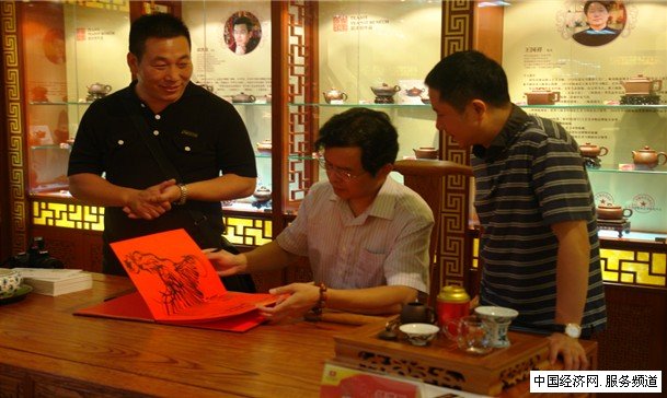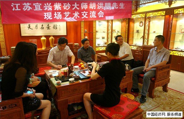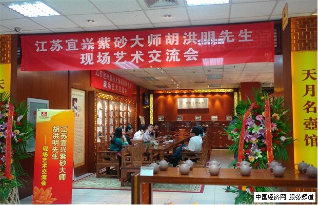 8月27日,由北京市天月茶超市舉辦的“江蘇宜興紫砂大師胡洪明先生現(xiàn)場藝術(shù)交流會”在馬連道茶城三樓天月茶超市隆重舉行。江蘇省工藝美術(shù)大師胡洪明、青年陶藝家胡迪鋒、北京天月盛世茶葉有限公司董事長李曉毅等應(yīng)邀出席。下午3:00,交流簽售會開始,先進行大師、壺友互動交流活動。主辦方相關(guān)專業(yè)人士扼要介紹了當(dāng)前宜興紫砂發(fā)展的現(xiàn)狀以及紫砂收藏的前景,提醒在收藏、把玩紫砂壺時要注意的問題。接著胡洪明大師就如何鑒賞、收藏紫砂壺回答了壺友提出的問題,他特別提出紫砂壺有一般產(chǎn)品、工藝品和藝術(shù)品區(qū)別,壺友要多學(xué)習(xí)、多接觸,以提高鑒賞能力并根據(jù)自己的愛好、能力來藏壺、玩壺。不少的壺友還帶來了自己的藏品,讓大師鑒定、品評,F(xiàn)場熱情的壺友紛紛選購自己喜歡的紫砂壺并請大師簽名,合影留念。 在展廳一角,吸引了不少紫砂壺愛好者,他們邊欣賞,便提問,這種近距離的接觸,讓人們有機會更多的增加對紫砂藝術(shù)和茶文化的了解。