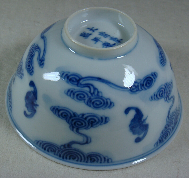 道光(1821—1850)、咸豐(1851—1861)、同治(1862—1874)時(shí)期的器物大體相近:青花發(fā)色飄浮,胎質(zhì)粗松,釉稀薄,胎釉結(jié)合不緊密,紋飾以吉祥圖案為主。