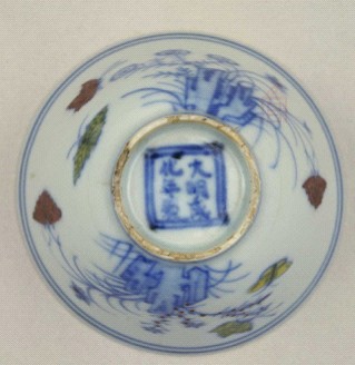 成化官窯款常以豎排雙行來構(gòu)圖,一半安置在器底,外圍雙方框或雙圓圈。圍飾的方框用手工畫成,線條規(guī)整度欠精密,并遺有因運(yùn)筆輕重不勻而留下的濃淡不一的色料痕。圍飾的圓圈,由于在陶車上操作,較為規(guī)整,但也往往遺有色料濃淡的烙痕。明成化官窯款,也有少數(shù)橫排一行或單排作半環(huán)形排列,安置于器物外壁口沿處。