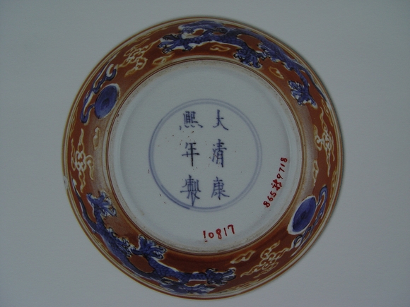 康熙琺瑯彩瓷,一般書“康熙御制”四字料款。康熙色釉瓷、青花釉里紅和彩瓷,大多書“大清康熙年制”兩行六字楷書款。小型精致的康熙豇豆紅瓷、天藍釉瓷等宮廷文房用具,往往書“大清康熙年制”三行六字楷書款。
