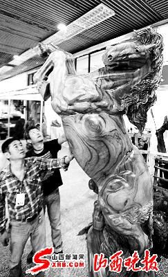 山西晉商收藏博覽會(huì)上,樟木雕塑《立馬成功》吸引眾人觀看。