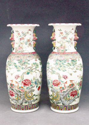 撣瓶也稱嫁妝瓶,其最初的用途就是供大戶人家往里邊插放雞毛撣子。后來,逐漸成為晚清到民國時期的居室陳設品,那時候撣瓶價值是非常高的。這對粉彩五倫圖雙獅耳撣瓶,器型碩大已非常罕見,再加上工藝精湛、品相完美、寓意吉祥,無疑成為當前收藏界熱捧的瓷器品種。