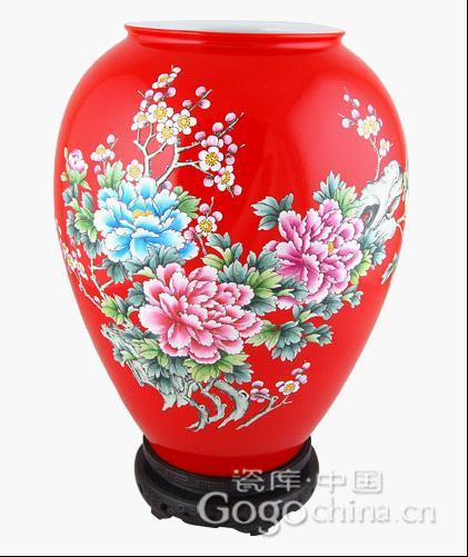 圖:中國紅瓷手繪國色天香蓮子缸