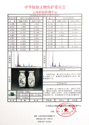 中心呂志堅(jiān)主任目鑒后,認(rèn)為系清代咸豐時(shí)期民窯燒造。隨后檢測(cè)人員在EDX3600L儀器上對(duì)釉、胎分別作無損取樣檢測(cè),最后得出結(jié)果:“送檢樣品胎、釉元素成分含量與19世紀(jì)中、晚期(包含清道光、咸豐、同治、光緒四朝)粉彩瓷器數(shù)據(jù)符合較好,屬景德鎮(zhèn)窯產(chǎn)品”。