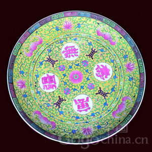 乾隆朝除了白地繪粉彩外,還有色地粉彩或色地開(kāi)光中繪粉彩等品種。乾隆朝粉彩的創(chuàng)新品種是在黃、綠、紅、粉、藍(lán)等色地上用極細(xì)的工具軋出纏枝忍冬或纏枝蔓草等延綿不斷的紋飾,且多和開(kāi)光一起使用,人稱(chēng)軋道開(kāi)光。這一工藝的出現(xiàn),將粉彩推上了更加富麗繁縟的頂峰,一直延續(xù)到民國(guó)。另外,乾隆朝還有部分在粉彩瓷器的內(nèi)壁及底足內(nèi)施綠彩,俗稱(chēng)"綠里綠底",一直流行到清末、民國(guó)。乾隆朝的"綠里綠底"極淺淡,迎光側(cè)看釉面有極細(xì)小的皺紋,像微風(fēng)吹過(guò)平靜的湖面而形成的細(xì)波。綠彩附著在白釉上非常緊密,幾乎沒(méi)有爆釉現(xiàn)象。