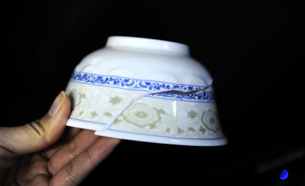 實(shí)驗(yàn)結(jié)果:在批發(fā)市場(chǎng)買來的“3號(hào)”碗當(dāng)場(chǎng)就摔出了10厘米左右的裂痕,而“1號(hào)”碗依然完好無缺。