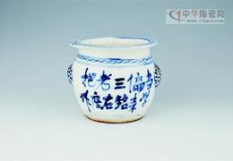 關(guān)明成的收藏中有幾個(gè)明清瓷壇,上有“狀元及第”、“五子登科”、“孝友為先”等文字,是那個(gè)時(shí)代提倡的道德規(guī)范,可謂口號(hào)陶瓷的濫觴。