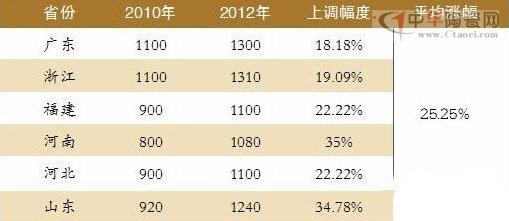 2010、2012我國衛(wèi)浴主要產(chǎn)區(qū)所在省份最低工資第一檔標(biāo)準(zhǔn)對比情況一覽表(單位:元)
