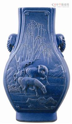 圖2 清“陳國治作”款淡藍(lán)釉柳下雙馬紋象耳瓶