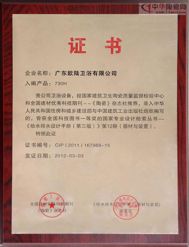 歐陸衛(wèi)浴智能坐便器OL-730H經(jīng)國家建筑衛(wèi)生陶瓷質(zhì)量監(jiān)督檢驗中心和全國建材優(yōu)秀科技期刊——由《陶瓷》雜志社推薦,錄入中華人民共和國住房和城鄉(xiāng)建設(shè)部與中國建筑工業(yè)出版社組織編寫的《給水排水設(shè)計手冊(第三版)》第12冊(器材與裝置)。