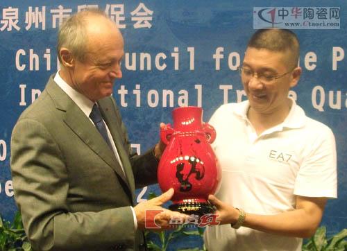 9月10日,在泉州市迎賓館迎賓樓召開的匈牙利中國品牌產(chǎn)品貿(mào)易中心項目推介會上,泉州市陳榮洲副市長代表泉州市人民政府和泉州民眾向遠道來華的匈牙利國家前總理邁杰希贈送了富貴紅陶瓷《天賦靈犀》。
