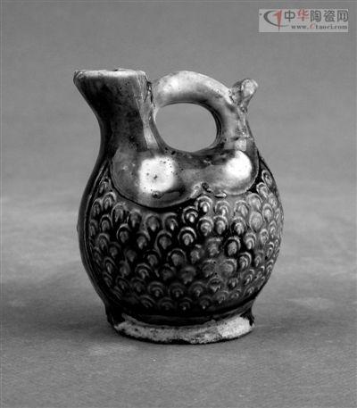 《唐代印花三彩扁壺》 深圳望野博物館藏這件三彩器,扁壺形,腹部有魚鱗狀印花,黃釉覆蓋,周邊有綠釉。釉色鮮艷,造型俊美,是有異域胡風的器具。