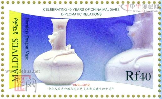 2012年10月14日,馬爾代夫郵政發(fā)行馬中建交40周年6枚一套紀念郵票,分別選用馬爾代夫傳統(tǒng)的多尼船與中國鄭和下西洋的帆船,馬爾代夫的木制漆器與中國瓷器,馬爾代夫的大海龜與中國的鱘魚作為郵票題材。其中第4枚的中國瓷器選用現(xiàn)代德化窯“中國白”螭龍瓶,面值為40盧比,郵票上印有“1972-2012,中華人民共和國與馬爾代夫共和國建交四十周年,螭龍瓶”的中英文字樣。該瓶為中國工藝美術大師柯宏榮與中國陶瓷藝術大師陳桂玉伉儷聯(lián)合創(chuàng)作。瓶高25厘米,底部有創(chuàng)作者的手刻款及篆字印章。