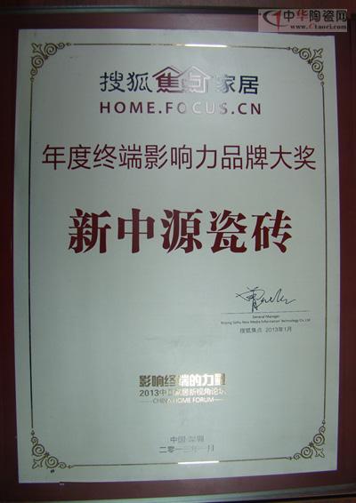 2013年1月17日,“影響終端的力量”2013家居新視角論壇在深圳京基100大廈瑞吉酒店隆重舉行。來自眾多機(jī)構(gòu)協(xié)會(huì)和知名企業(yè)的領(lǐng)導(dǎo)、領(lǐng)袖企業(yè)家及行業(yè)精英等共300余名行業(yè)嘉賓蒞臨現(xiàn)場(chǎng),圍繞以終端用戶為中心的話題,全面探討了家居行業(yè)的現(xiàn)狀與發(fā)展,探尋影響終端的力量。同時(shí)主辦方聯(lián)合中國建筑裝飾協(xié)會(huì)、中國建筑衛(wèi)生陶瓷協(xié)會(huì)及中國家具協(xié)會(huì)等支持機(jī)構(gòu)共同對(duì)2012年度終端表現(xiàn)突出的家居品牌進(jìn)行表彰和鼓勵(lì),新中源陶瓷憑借卓越的行業(yè)美譽(yù)度和強(qiáng)大的終端品牌影響力,榮獲“年度終端影響力品牌”。
