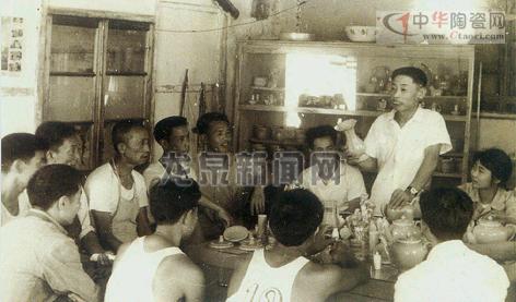 銷路問題解決了,隨著新廠成立而來的難題也被一個個攻克了。賴自強帶領技術骨干進行青瓷胎釉、造型和生產(chǎn)工藝試驗。廠里的工人們經(jīng)常圍著賴自強討教青瓷方面的問題,照片正是拍于那個時候。