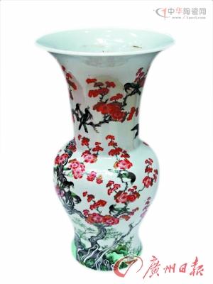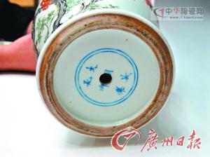 本次送來鑒定的是來自勒流梁姓收藏家的一款美輪美奐的五彩描金花瓶,雖然底部有清晰的文字寫明是“大明成化年制”,但廣東省收藏家協(xié)會(huì)副主席、廣州市古玩行業(yè)商會(huì)副會(huì)長(zhǎng)潘繼生卻鑒定出為康熙年的仿制品。盡管是康熙仿品,但因?yàn)槭俏宀拭杞穑滴跷宀视质侵袊?guó)瓷器歷史上“真正五彩”,所以其蘊(yùn)含的歷史意義非常豐富。略為可惜的是,這件漂亮的花瓶因?yàn)楫?dāng)年是出口貨品,外國(guó)人不明白這種花瓶的特殊構(gòu)造,以為是燈具,將瓶底鉆一小孔插入燭臺(tái),讓這件稀世之寶破了相。潘繼生最后的鑒定為“五彩描金梅雀花舩”,其中“舩”并不是“船”的意思,而是瓷器界對(duì)這種類型瓷器的特定稱呼。