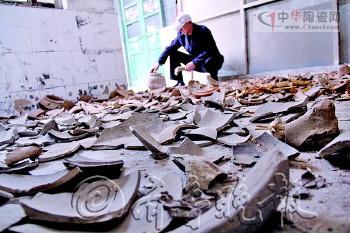 徐安振在查看使用宋代古瓷粘拼的瓷碗、古瓷罐。