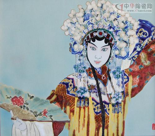 在正對著工作室進門的地方,放有一幅加框后長2.5米、高2.25米的《觀音出行圖》,十分搶眼。這正是周志兵耗費三個星期時間創(chuàng)作的一幅高溫顏色釉大作,剛畫完時并不十分激動,因為更加期待的是開窯的那一瞬間,成敗均在此一燒。“高溫顏色釉作品的尺寸越大,就越危險”周志兵說,“記得當時老板告訴我這塊瓷板如果燒壞了,需要周志兵自己承擔燒制費用,因為瓷板面積太大,成功率實在難以保證。沒想到出窯結果還是挺滿意的。”還有以真人扮的京劇角兒為原型的《貴妃醉酒》、,在此基礎上進行變形為現(xiàn)在的除了手部線條刻畫外的無線條形體,燒制完成后,作品使人產生強烈的視覺沖擊。